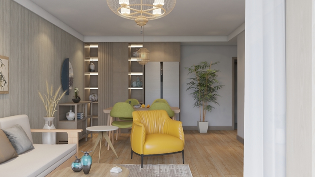 玄關(guān)處地面是原木色的木地板,家具是采用的原木色的木質(zhì)家具,整體給人一種特別溫馨的感受。餐桌旁邊放置的綠植更是給整個空間增添了清新活力。